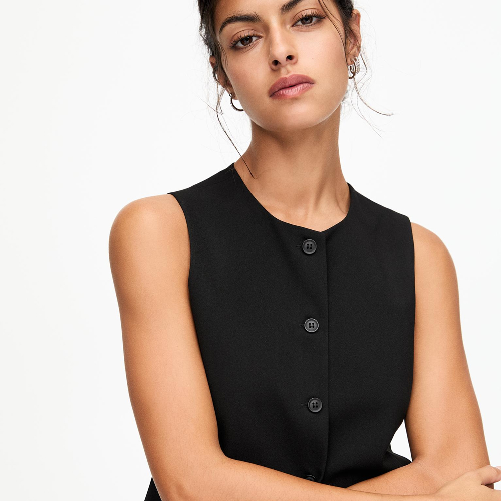 Button-up shirt sleeves and a relaxed silhouette. It’s tailored with drapey, crinkle-texture fabric that’s made from LENZING™ ECOVERO™ Viscose — responsibly sourced wood-based fibres produced through a process that reduces impact on forests, biodiversity and water supply.